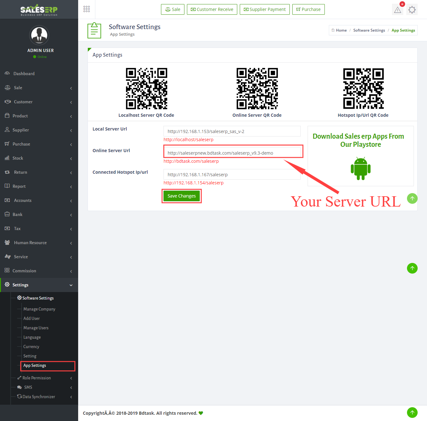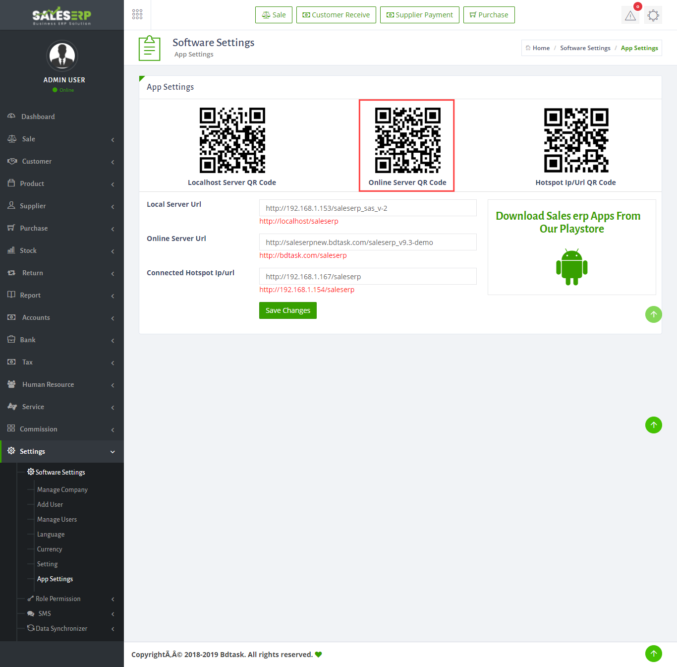 - The Android app can connect with Sales ERP online and offline version also. All the data will be sink in your software. A software can connect with multiple android app. A smart phone can play the role of POS. you can use Android app instead of desktop version. Our app is subscription based. for first time you will get 1 month free subscription.