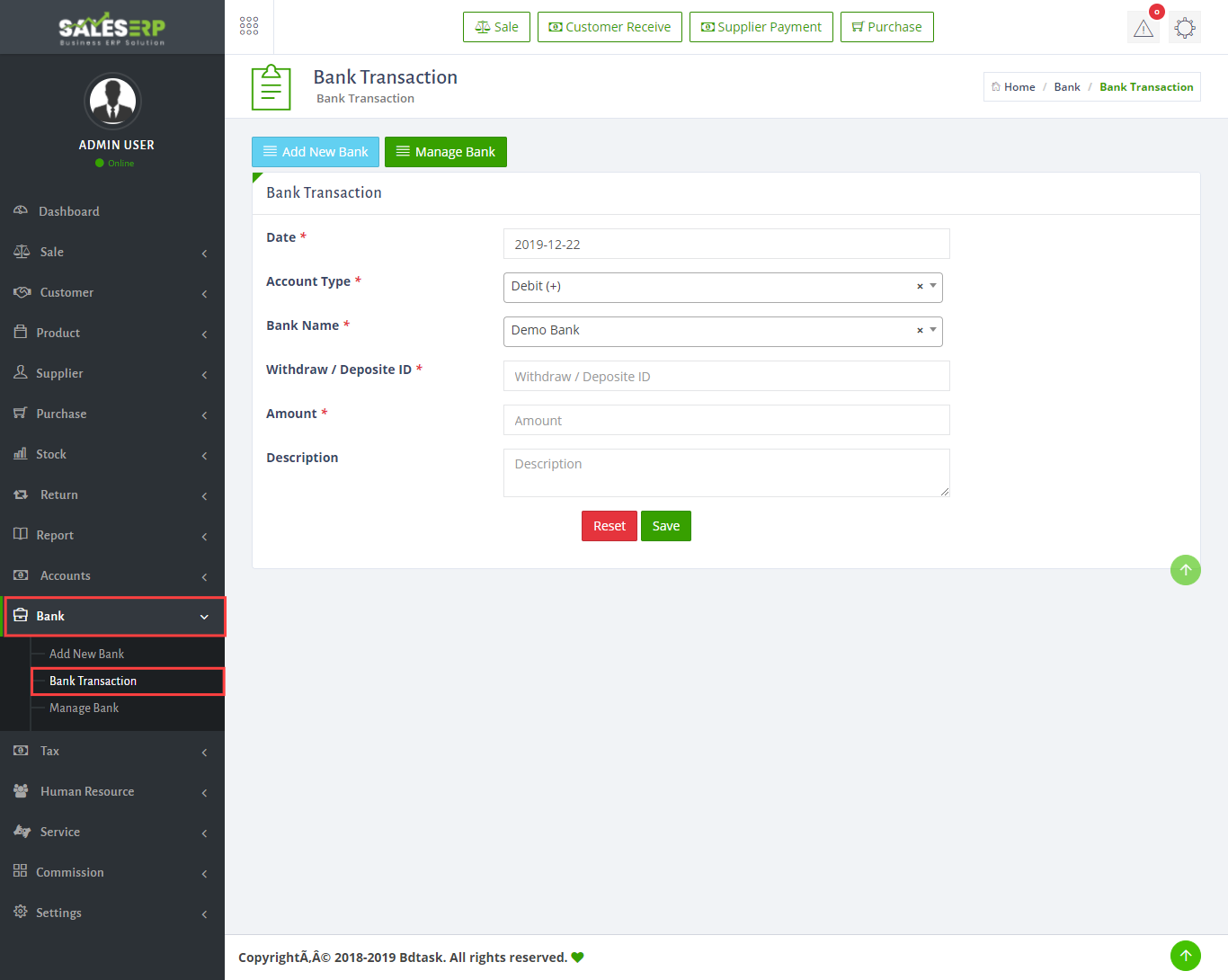 - Sales ERP has a total bank module to add manage your bank transaction just go to the Bank > Bank transaction