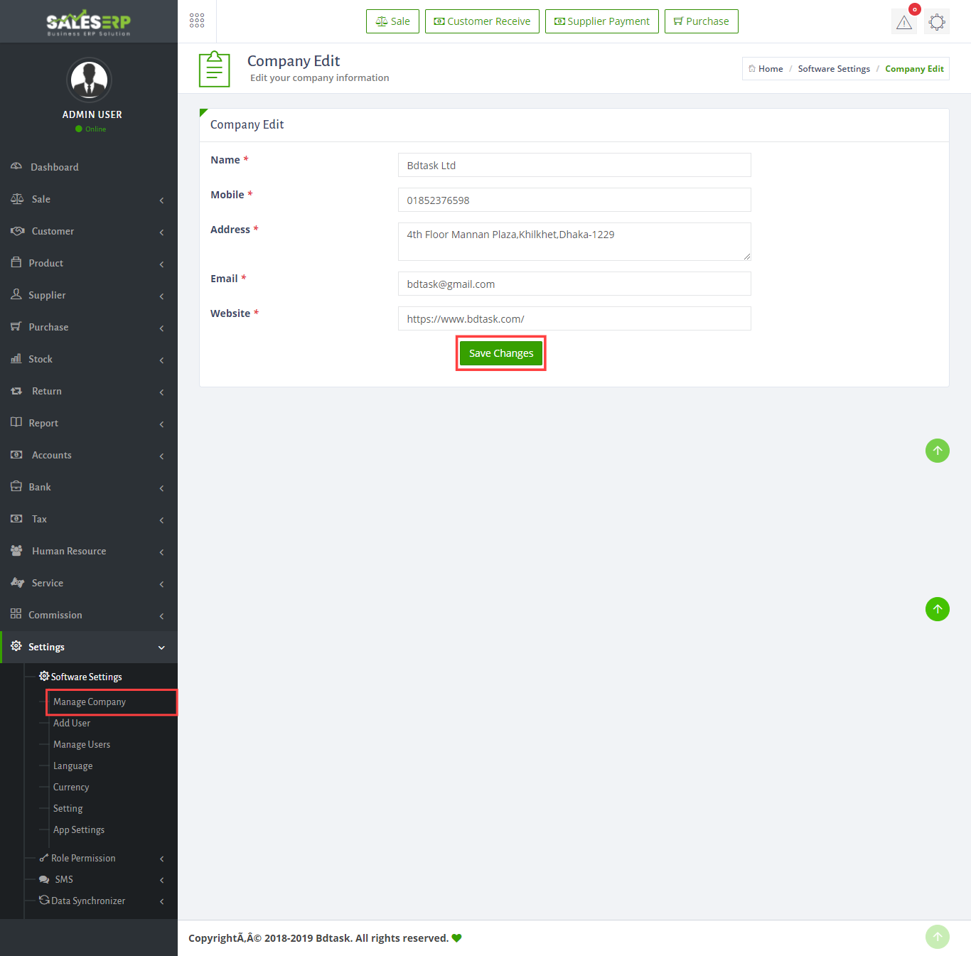 - To change your company name ,address and others details just go to Settings > Software Setting > Manage Company then look at the picture and click action option.