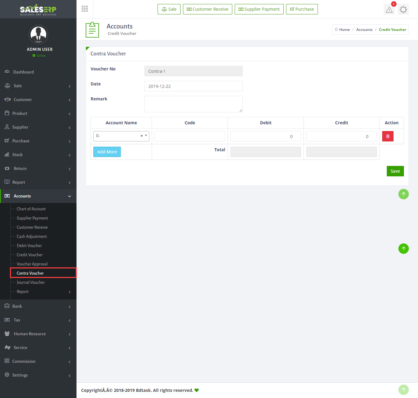 - To create a credit voucher just go to Accounts > credit voucher and fill up information then click save button.