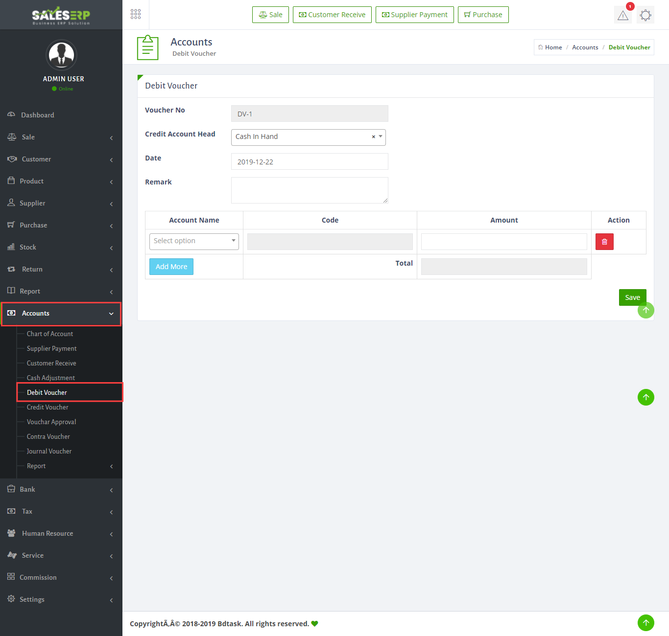 - To create a debit voucher just go to Accounts > debit voucher and fill up information then click save button.